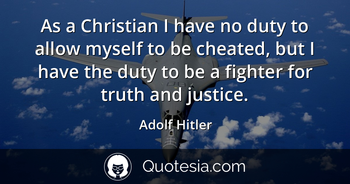 As a Christian I have no duty to allow myself to be cheated but I have the duty to be a fighter for truth and justice - Adolf Hitler. All great movements are popular movements. Agree with me or dont agree with me.